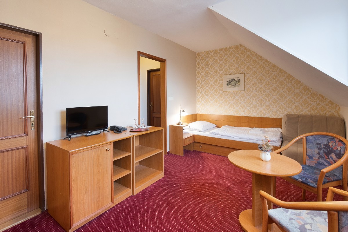 Standardně zařízené pokoje s manželskou postelí nebo oddělenými lůžky a vlastním sociálním zařízením (koupelna se sprchovým koutem nebo vanou, toaleta) na pokoji. U tří a čtyřlůžkových pokojů je vyjma manželské postele k dispozici 1 nebo 2 přistýlky. Na pokojích je k dispozici psací stůl, křesla, šatní skříň, ručníky, osušky, hygienické potřeby a fén. Samozřejmostí je Wi-Fi síť.