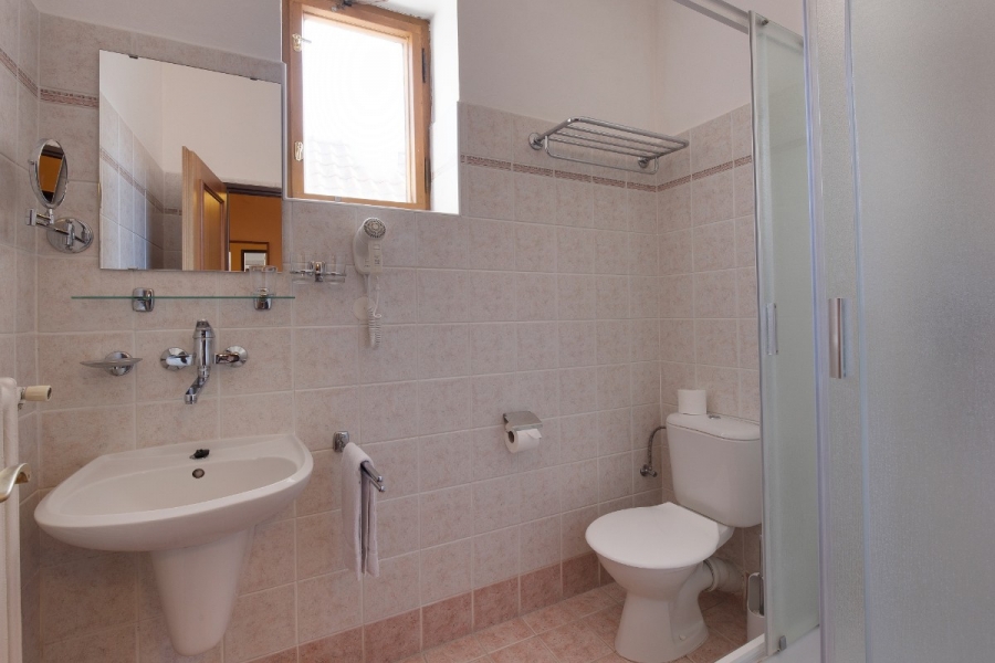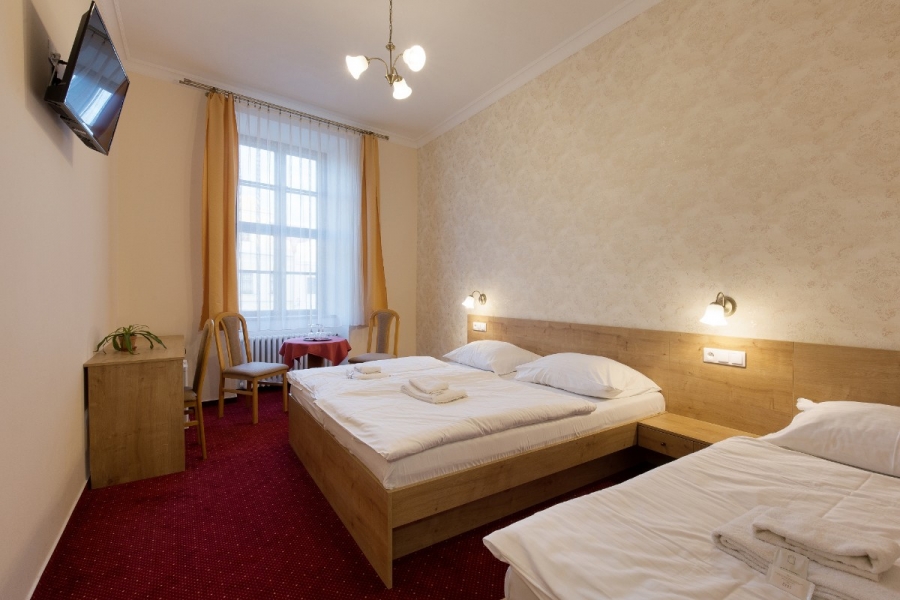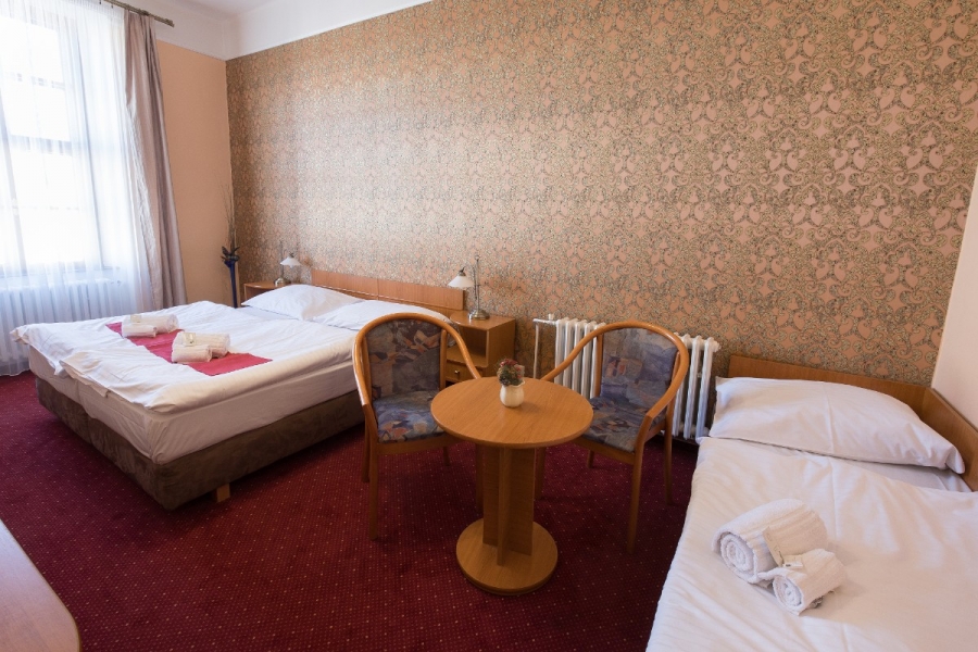 Standardně zařízené pokoje s manželskou postelí nebo oddělenými lůžky a vlastním sociálním zařízením (koupelna se sprchovým koutem nebo vanou, toaleta) na pokoji. U třílůžkového pokoje je vyjma manželské postele k dispozici 1 přistýlka. Na pokojích je k dispozici psací stůl, křesla, lednička, šatní skříň, ručníky, osušky, hygienické potřeby a fén. Samozřejmostí je Wi-Fi síť.